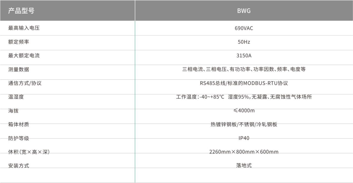 BWG光伏并网柜是承接集中式逆变器与升压变压器或交流汇流箱与升压变压器的重要组成部分,此光伏并网柜的进线采用断路器输入或直接输入,输出采用断路器或负荷隔离开关,母线采用电镀或纯化后的母线连接,并提供二级防雷保护,系统额定电压最高为AC690V,防护等级室内为IP40、室外为IP65;二次测量及控制的电缆,电流为大于2.5m㎡的电缆,电压为大1.5m㎡的电缆,控制为大于1.0m㎡的电缆,测量电流互感器为0.5级的电流互感器,计量互感器为0.2S级的电流互感器。还可根据客户要求增加相关的功能等。此产品采用专业的电气设计、元件选型,使柜体内部结构安全、简洁、美观、方便现场接线及维护并保证设备长时间的稳定工作。