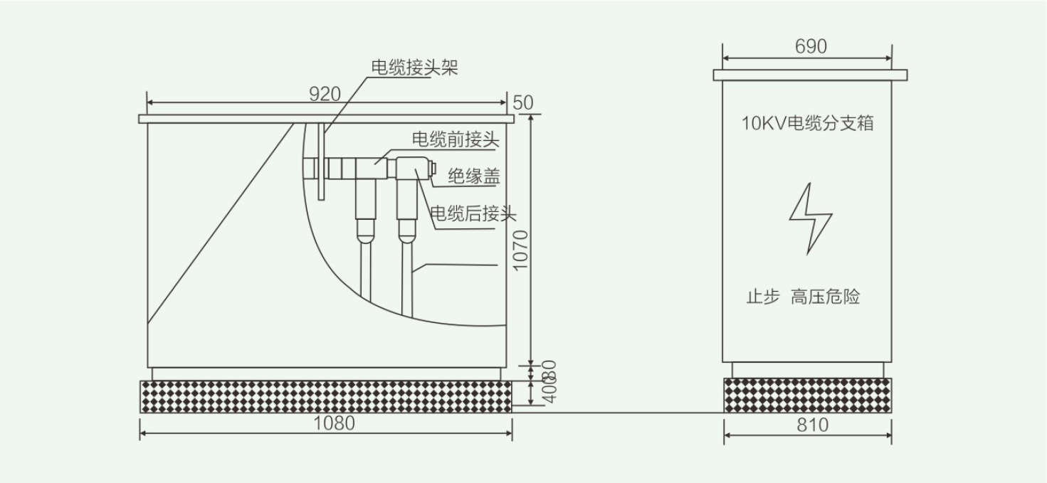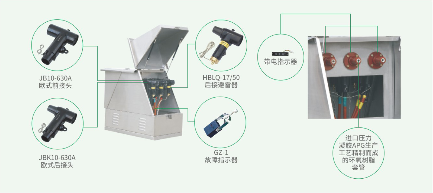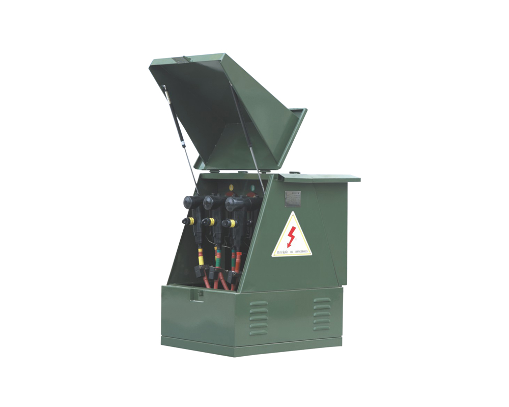 母线室是由2mm钢板围成的密封室。电缆接头支架位于母线室的上部,用来支撑套管,套管则用来固定电缆接头,电缆接头的相间距离为180mm。如果是带避雷器型,避雷器安装在电缆接头的尾部。另外,短路指示器和带电显示器也装在母线室内。母线室所有带电部件都进行严格的硅橡胶外包绝缘处理。电缆仓位于母线室下部,是电缆进出的通道,仓内有电缆固定夹和接地端子。