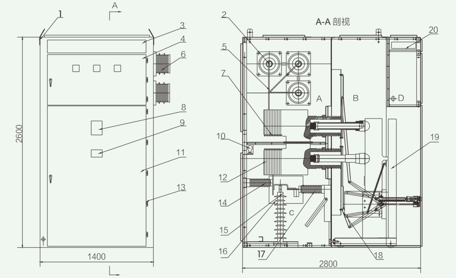 A、母线室 B、手车室 C、电缆室 D、继电器仪表室 1、吊环 2、主母线 3、小母线室盖环 4、仪表室门 5、分支母线 6、母线套管 7、触头盒 8、模拟母线圈 9、铭牌 10、照明灯 11、手车室门 12、电流互感器 13、铰链 14、绝缘子 15、氧化锌闭雷器 16、绝缘隔板 17、接地开关 18、活门装配 19、真空断路器手车 20、小母线端子室