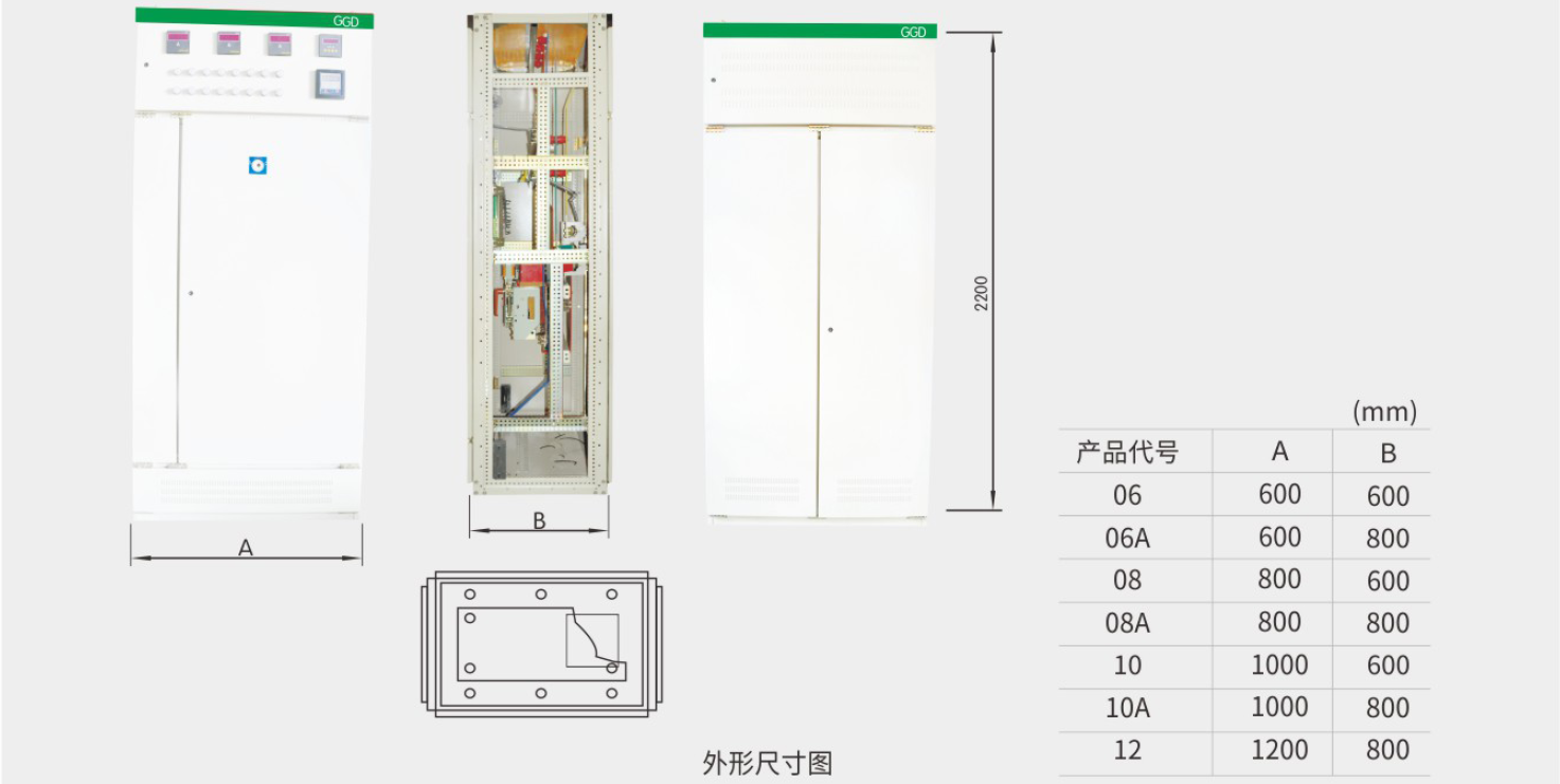 GGD型低压固定式成套开关设备适用于发厂、变电所、工矿企业等电力用户作为交流50Hz,额定工作电压380V,额定电流至3150A的配电系统中作为动力,照明及配电设备的电能转换、分配与控制之用。该产品分断能力高,额定短时耐受电流达50KA。线路方案灵活、组合